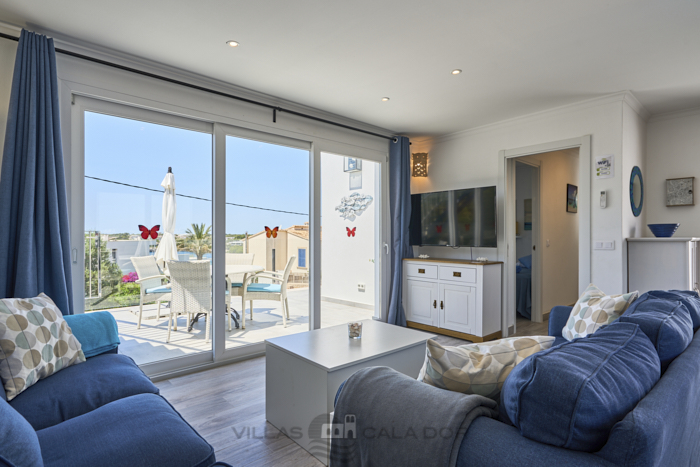 Das Wohnzimmer im ersten Stock hat Zugang zu einer Terrasse. Von dieser Terrasse führt eine Treppe zur Dachterrasse mit Chill-out-Bereich und herrlichem Blick auf Porto Petro.