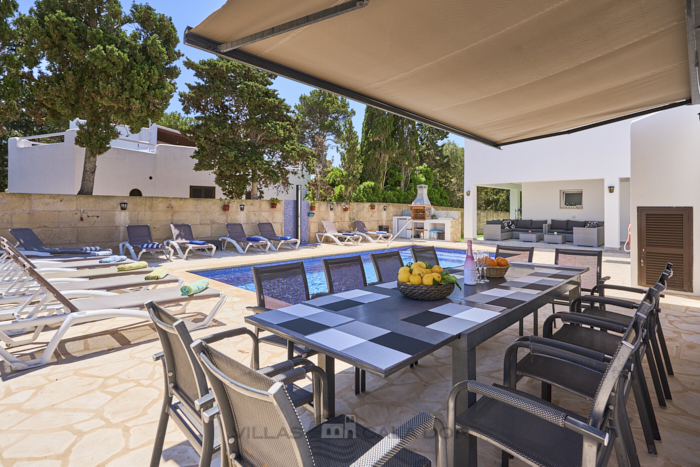 Neben dem Pool gibt es einen Essbereich mit großer Markise, um Mahlzeiten im Freien zu genießen.