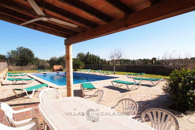 Bonita terraza con tumbonas y zonas de césped alrededor de la gran piscina. Hay una zona cubierta junto a la piscina con una barbacoa de obra, un fregadero y una nevera con una mesa y sillas para disfrutar de deliciosas cenas "al fresco".